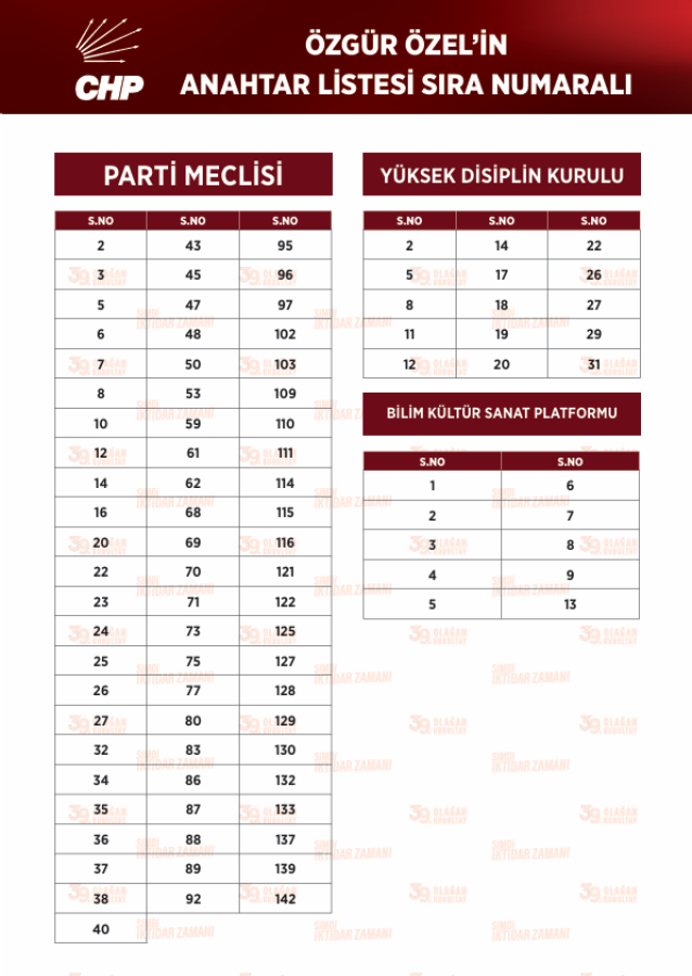 CHP'nin 39'uncu Olağan Kurultayı'nda Parti Meclisi üyeliği için 151, Yüksek Disiplin Kurulu üyeliği için 37 aday başvuru yaptı.