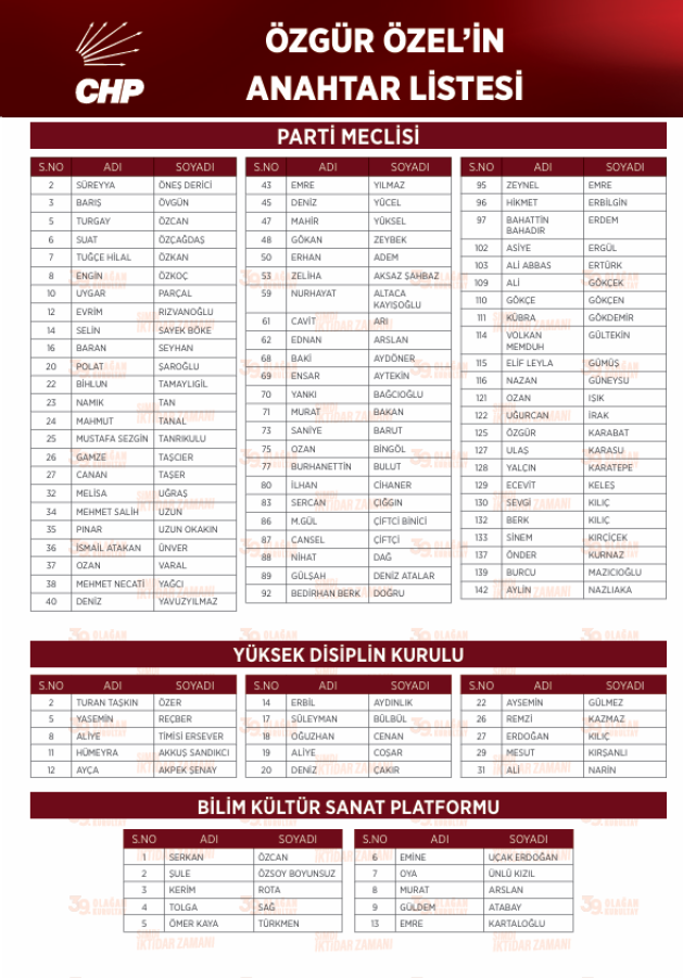 Özgür Özel'in, Parti Meclisi seçimi için sunduğu anahtar liste şekillenmeye başladı. Mevcut Parti Meclisi'ndeki 49 ismin yeri korurken, listede 31 yeni isim yer aldı.