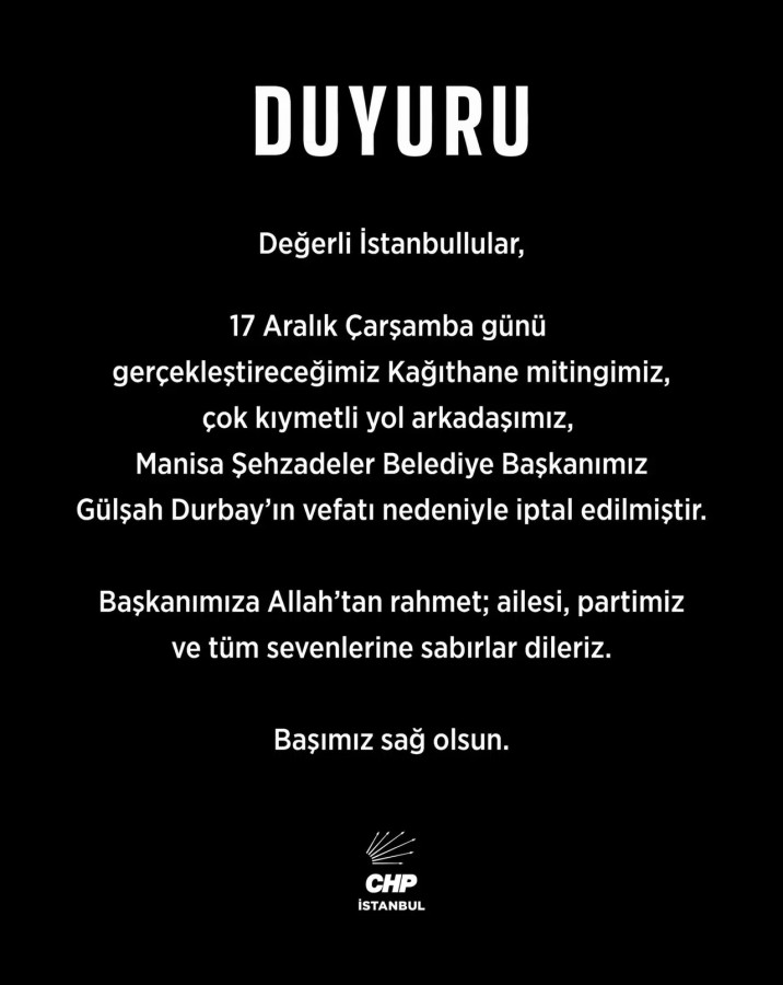"17 Aralık Çarşamba günü gerçekleştireceğimiz Kağıthane mitingimiz, çok kıymetli yol arkadaşımız, Manisa Şehzadeler Belediye Başkanımız Gülşah Durbay'ın vefatı nedeniyle iptal edilmiştir.