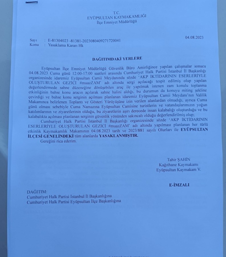 "CHP İstanbul İl Başkanlığı'nın AK Parti iktidarının eserleriyle oluşturduğu gezici #muazZAM Sergi Eyüpsultan Kaymakamlığı'nın aldığı karar doğrultusunda yasaklanmıştır. CHP İstanbul İl Başkanı Dr. Canan Kaftancıoğlu 4.8.2023 (bugün) saat 16.00'da Eyüpsultan meydanında zamlardan nefes alamaz hale gelen vatandaşlarla buluşacaktır."