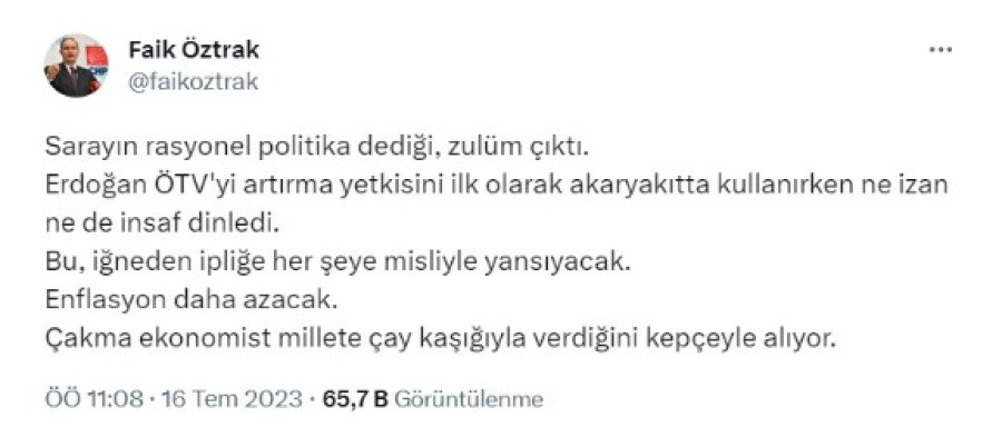 CHP Sözcüsü Faik Öztrak da akaryakıta gelen ÖTV zammına ilişkin sosyal medya hesabından yaptığı paylaşımda şu ifadelere yer verdi:
