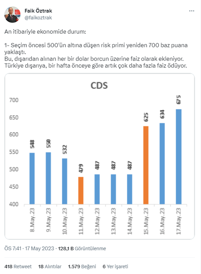 "An itibariyle ekonomide durum: Seçim öncesi 500'ün altına düşen risk primi yeniden 700 baz puana yaklaştı. Bu, dışarıdan alınan her bir dolar borcun üzerine faiz olarak ekleniyor. Türkiye dışarıya, bir hafta önceye göre artık çok daha fazla faiz ödüyor.