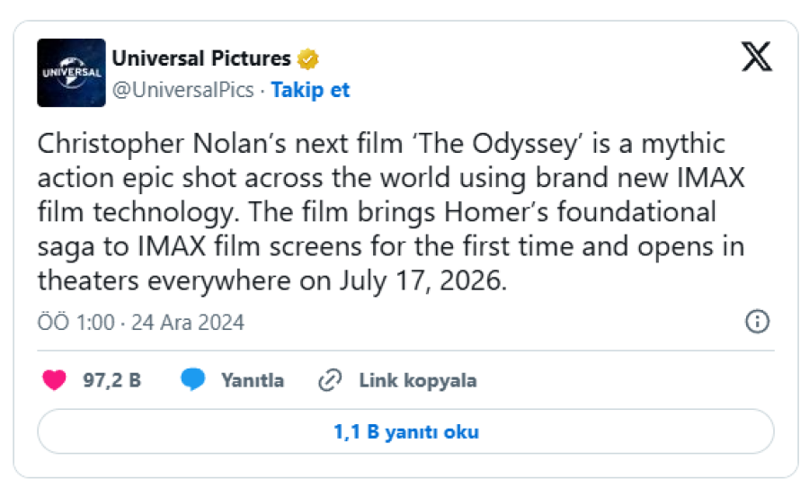 Nolan'ın senaryosunu da kaleme alacağı film, Homeros'un destanını ilk kez IMAX ekranlarına taşıyacak ve 17 Temmuz 2026'da tüm sinemalarda gösterime girecek.