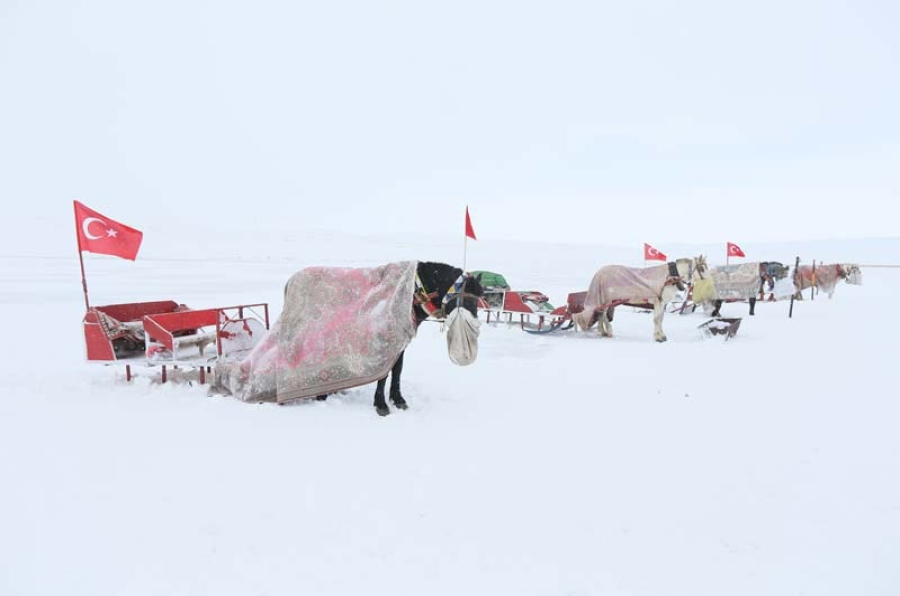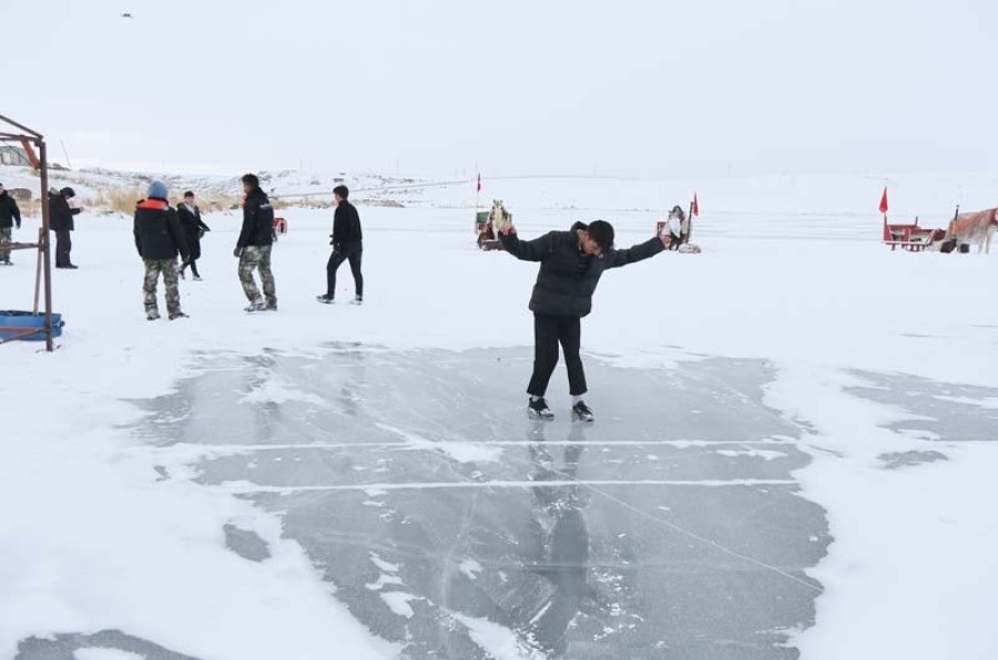 Kars ve Ardahan sınırında yer alan Çıldır Gölü'nün donan bir bölümüne atlı kızaklar çıkarılmaya başlandı. Gölde, buz kalınlığının 10 santimetreyi aştı.