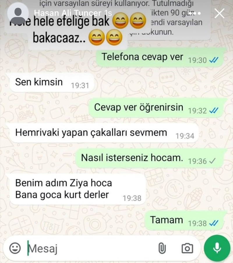 Hasan Ali Tuncer, yazdığı son mesaja aldığı, "Benim adım Ziya Hoca, bana koca kurt, derler. Ben Serik'te 35 yıllık eğitimciyim. Çok öğrenci yetiştirdim." cevabının ardından tekrar görüşmek için arama yaptı.