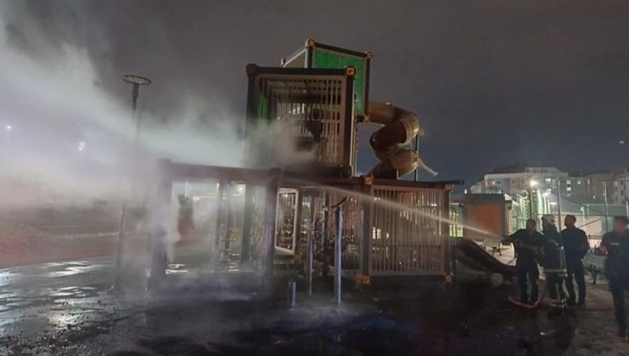 Ekiplerin söndürdüğü yangın sonrası alandaki çocuk oyun grupları hasar gördü.