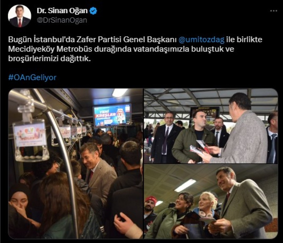 Sinan Oğan, sosyal medya hesabında, Ümit Özdağ ile birlikte dağıttığı seçim broşürlerini paylaşarak, "Bugün İstanbul'da, Zafer Partisi Genel Başkanı Ümit Özdağ ile birlikte Mecidiyeköy Metrobüs durağında vatandaşımızla buluştuk ve broşürlerimizi dağıttık" dedi.
