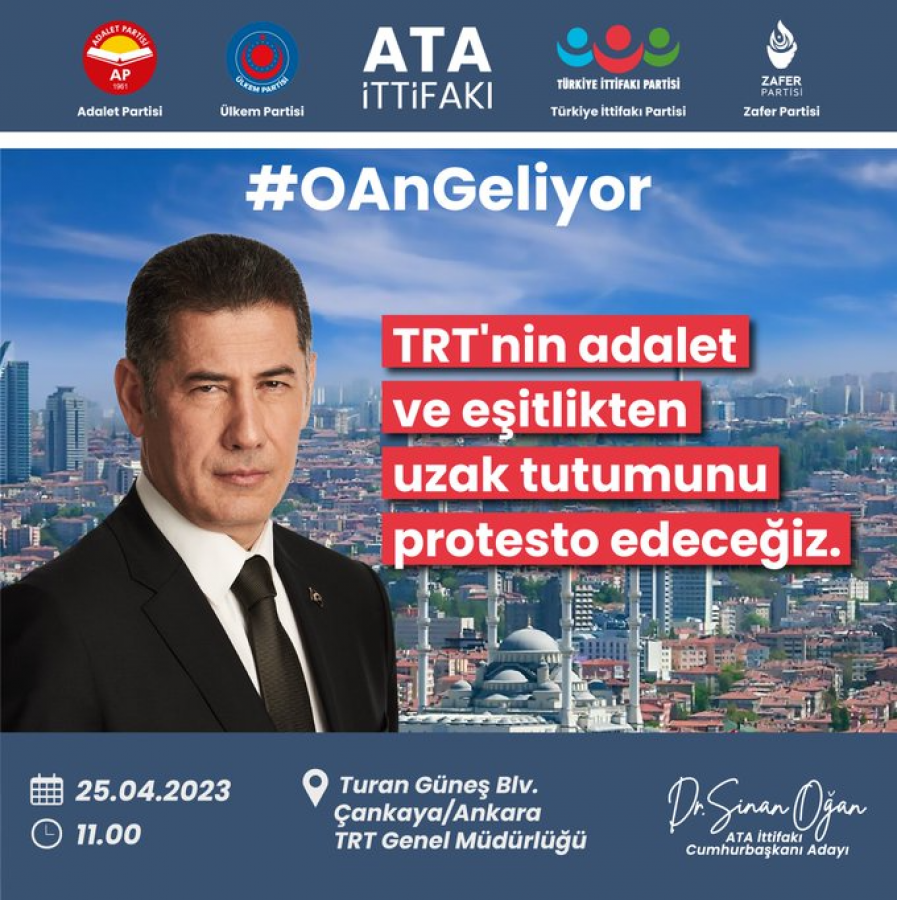 ATA İttifakı'nın Cumhurbaşkanı adayı Sinan Oğan, sosyal medya hesabı üzerinden yaptığı açıklamada, "Yarın saat 11.00'de TRT Genel Müdürlüğü önünde; bizlere yer verme zorunluluğu olmasına rağmen yer vermeyen TRT'yi protesto edeceğim. Tüm medya mensuplarını, basın açıklaması yapacağım TRT Genel Müdürlüğü önüne davet ediyorum" ifadesinde bulundu.