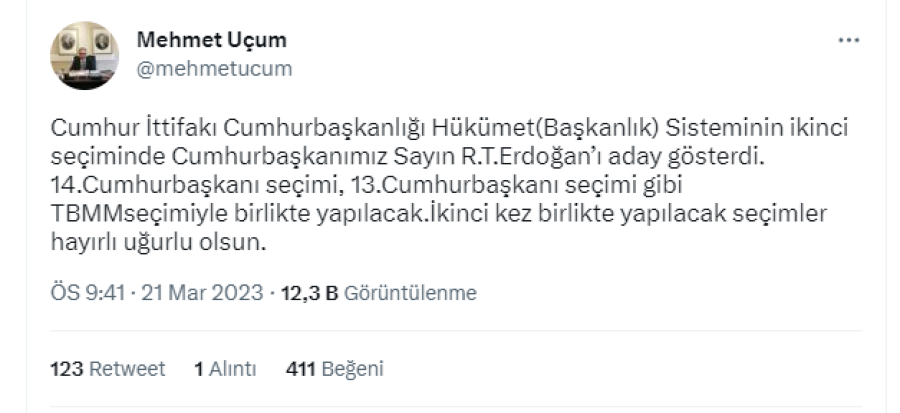 Uçum, paylaşımında şu ifadeleri kullandı: "Cumhur İttifakı Cumhurbaşkanlığı Hükümet(Başkanlık) Sisteminin ikinci seçiminde Cumhurbaşkanımız Sayın R.T.Erdoğan'ı aday gösterdi. 14. Cumhurbaşkanı seçimi, 13. Cumhurbaşkanı seçimi gibi TBMM seçimiyle birlikte yapılacak. İkinci kez birlikte yapılacak seçimler hayırlı uğurlu olsun."4