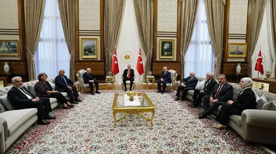 Cumhurbaşkanı Recep Tayyip Erdoğan, MHP Genel Başkanı Devlet Bahçeli'yi Cumhurbaşkanlığı Külliyesi'nde kabul etti.