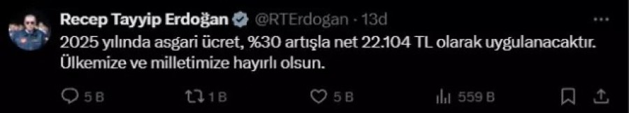 Cumhurbaşkanı Erdoğan, kişisel sosyal medya hesabından yaptığı paylaşımda, "2025 yılında asgari ücret yüzde 30 artışla net 22 bin 104 TL olarak uygulanacaktır. Ülkemize ve milletimize hayırlı olsun." ifadesini kullandı.