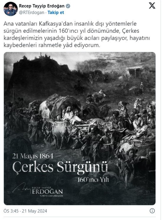 "Ana vatanları Kafkasya'dan insanlık dışı yöntemlerle sürgün edilmelerinin 160'ıncı yıl dönümünde, Çerkes kardeşlerimizin yaşadığı büyük acıları paylaşıyor, hayatını kaybedenleri rahmetle yâd ediyorum."