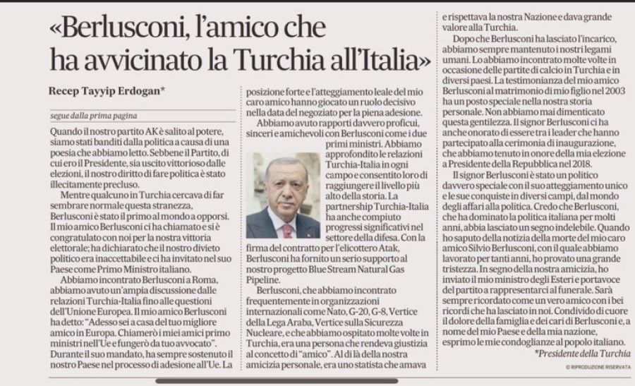 Cumhurbaşkanı Recep Tayyip Erdoğan, İtalya Eski Başbakanı Silvio Berlusconi için Il Messaggero gazetesinde yazı kaleme aldı.