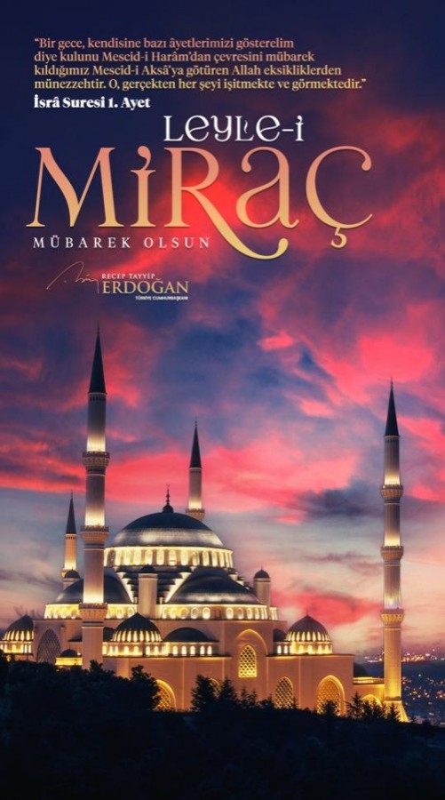 Erdoğan yaptığı paylaşımda, "Aziz milletimizin ve İslam âleminin Leyle-i Miracını tebrik ediyorum. İçerisinde olduğumuz zor günlerde idrak ettiğimiz, Rabbimizin sonsuz hikmetiyle dolu bu mübarek gecenin ülkemize sağlık, huzur ve hayırlar getirmesini diliyorum. Gecemiz mübarek olsun" ifadelerine yer verdi.