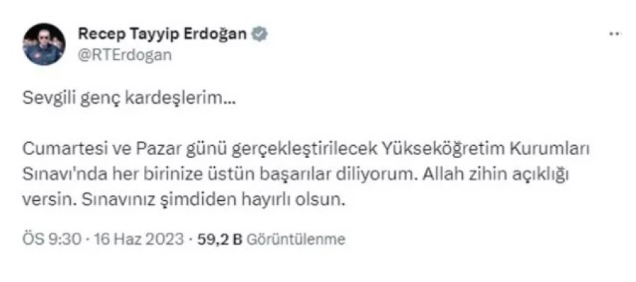 Cumhurbaşkanı Erdoğan, Yükseköğretim Kurumları Sınavı'na girecek öğrenciler için Twitter hesabından paylaşım yaptı. Erdoğan yaptığı paylaşımında, "Sevgili genç kardeşlerim... Cumartesi ve Pazar günü gerçekleştirilecek Yükseköğretim Kurumları Sınavı'nda her birinize üstün başarılar diliyorum. Allah zihin açıklığı versin. Sınavınız şimdiden hayırlı olsun." dedi.