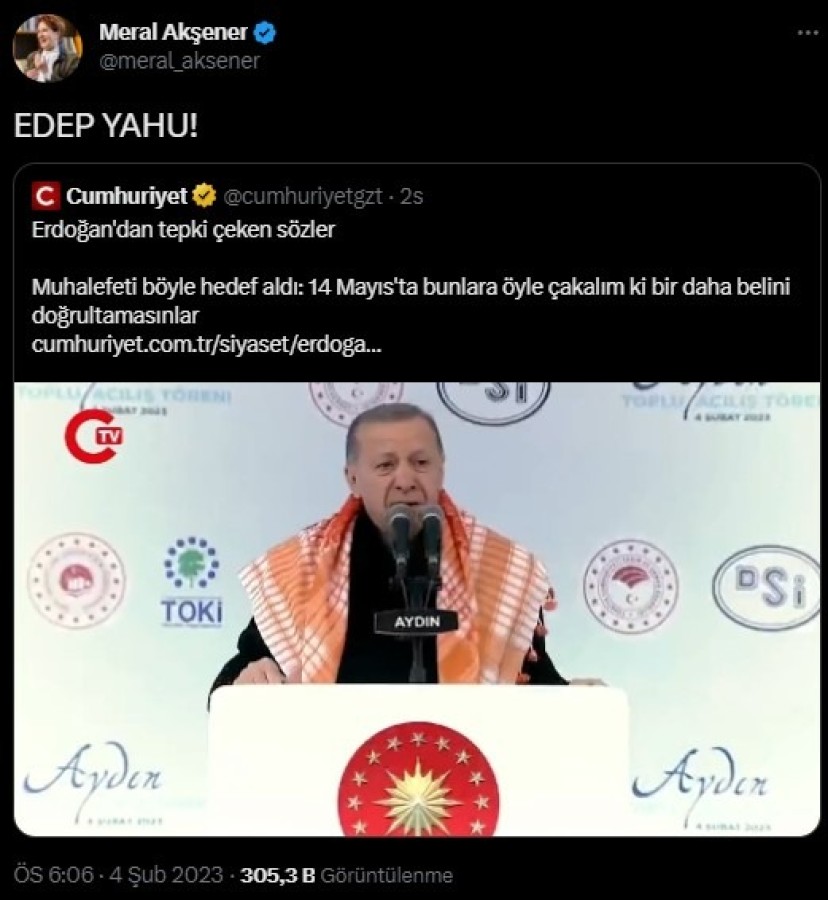 İYİ Parti Genel Başkanı Meral Akşener, sosyal medya hesabından yaptığı paylaşımda, Cumhurbaşkanı ve AK Parti Genel Başkanı Recep Tayyip Erdoğan'ın muhalefeti hedef alan "14 Mayıs'ta bunlara öyle çakalım ki bir daha belini doğrultamasınlar" sözlerini alıntılayarak, "edep yahu!" ifadelerini kullandı.