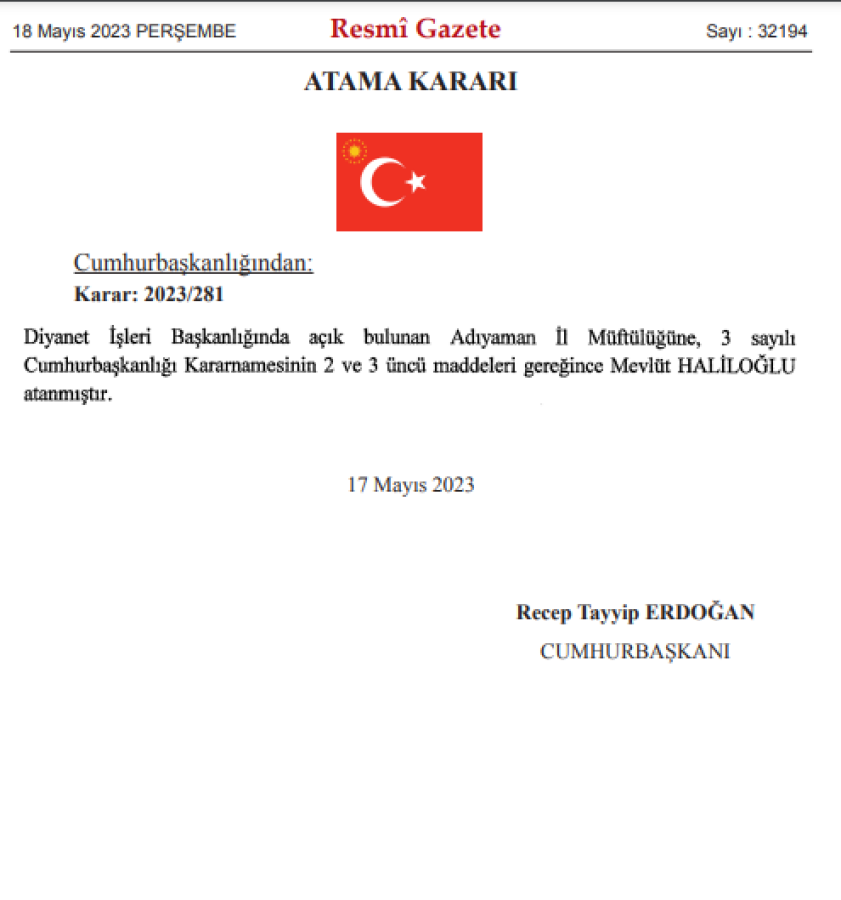 Cumhurbaşkanı ve AK Parti Genel Başkanı Recep Tayyip Erdoğan imzasıyla Resmî Gazete'de yayımlanan karara göre, Diyanet İşleri Başkanlığında açık bulunan Adıyaman İl Müftülüğüne Mevlüt Haliloğlu getirildi.