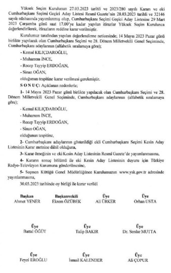 14 Mayıs tarihinde gerçekleştirilecek genel seçimlerde yarışacak kesin adayların listesi Resmi Gazete'de yayımlandı. Buna göre, kesin aday listesinde yer alan isimler, Cumhurbaşkanı ve Cumhur İttifakı'nın adayı Recep Tayyip Erdoğan, CHP Genel Başkanı ve Millet İttifakı'nın adayı Kemal Kılıçdaroğlu, Memleket Partisi Genel Başkanı Muharrem İnce ve ATA İttifakı'nın adayı Sinan Oğan oldu.