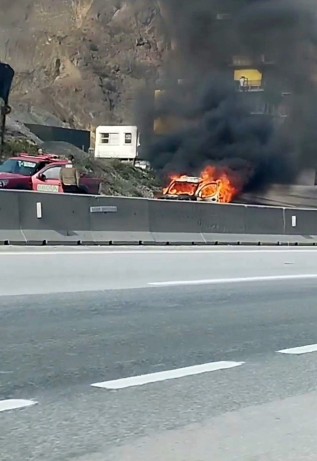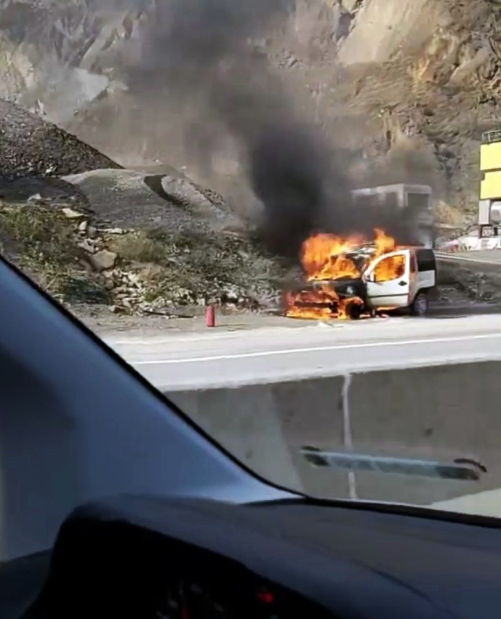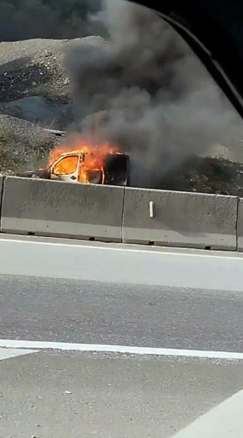 Sakarya'da D-650 karayolunda alev topuna dönen hafif ticari araç kullanılamaz hale geldi. Aracın alev alev yandığı anlar cep telefonu kamerasına yansıdı.