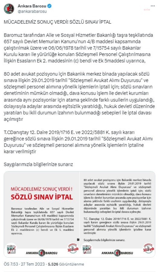 Ankara Barosu, Aile ve Sosyal Hizmetler Bakanlığının sözleşmeli avukat alımında yapılacak olan sözlü sınavın iptali için mahkemeye başvurdu. Baro, "adaylar arasında eşitsizlik yaratıldığı, hukuk devleti düzeninde yaratılan bu ikili durumun izahının bulunmadığı" sebepleri ile iptal davası açtı. Baro; sosyal medya hesabından, bugün sözlü sınavın Danıştay tarafından iptal edildiğini duyurdu.