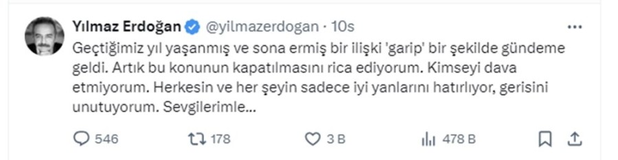 "Geçen yıl yaşanmış ve sona ermiş bir ilişki 'garip' bir şekilde gündeme geldi. Artık bu konunun kapatılmasını rica ediyorum. Kimseyi dava etmiyorum. Herkesin ve her şeyin sadece iyi yanlarını hatırlıyor, gerisini unutuyorum. Sevgilerimle..."