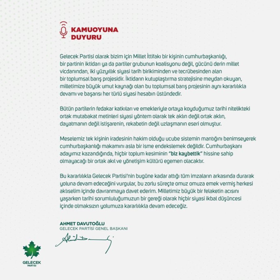 Gelecek Partisi Genel Başkanı Ahmet Davutoğlu, Meral Akşener'in Altılı Masa'dan ayrılmasının ardından yaptığı açıklamada, "Attığımız tüm imzaların arkasındayız; tarihi sorumluluğumuzun bir gereği olarak hiçbir siyasi ikbal düşüncesi içinde olmaksızın yolumuza kararlılıkla devam edeceğiz" dedi.