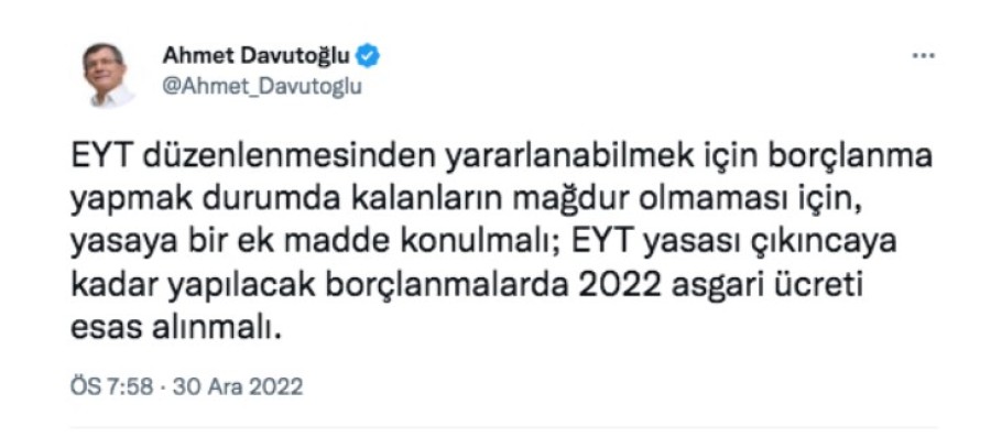 Gelecek Partisi Genel Başkanı Ahmet Davutoğlu, EYT yasası çıkıncaya kadar yapılacak borçlanmalarda 2022 asgari ücretinin esas alınması gerektiğini söyledi.