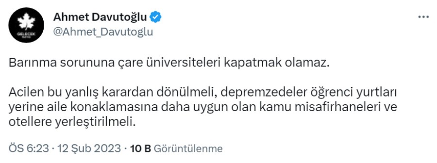 Merkez üssü Kahramanmaraş'ın Pazarcık ve Elbistan ilçeleri olan, 6 Şubat'ta 9 saat arayla meydana gelen ve 10 ilde büyük bir yıkıma neden olan depremlerin ardından, Cumhurbaşkanı ve AK Parti Genel Başkanı Recep Tayyip Erdoğan üniversitelerin ve Kredi Yurtlar Kurumu'na(KYK) ait yurtların depremzedelere tahsil edileceğini ve üniversitelerde uzaktan eğitime geçileceğini açıkladı. Davutoğlu karara sosyal medya hesabından yaptığı paylaşım ile tepki gösterdi.