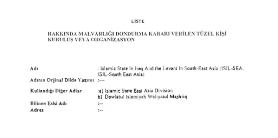 DEAŞ ve El Kaide ile bağlantılı ISIL-SEA adlı terör örgütünün Türkiye'deki mal varlığının dondurulmasına ilişkin karar Resmi Gazete'nin mükerrer sayısında yayınlandı. Cumhurbaşkanı ve AK Parti Genel Başkanı Recep Tayyip Erdoğan'ın imzasını taşıyan karara göre; ISIL-SEA adlı terör örgütünün Türkiye'deki mal varlığı, terör örgütleri IŞİD ve El Kaide ile bağlantılı olduğu gerekçesiyle donduruldu.