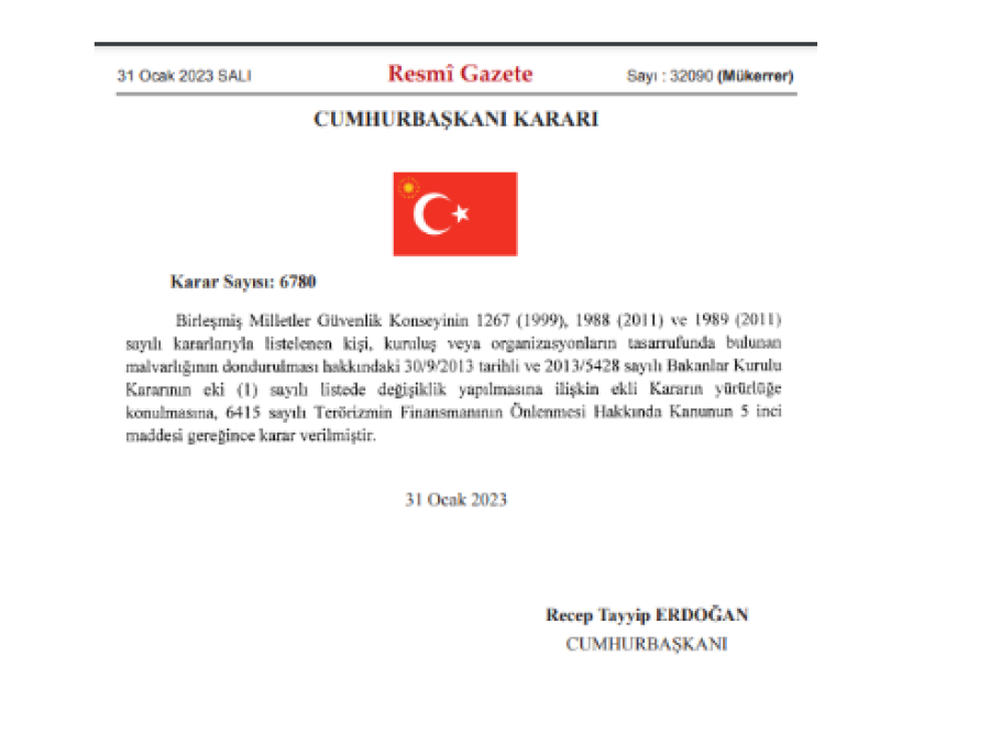 "Birleşmiş Milletler Güvenlik Konseyi'nin 1267 (1999), 1988 (2011) ve 1989 (2011) sayılı kararlarıyla listelenen kişi, kuruluş veya organizasyonların tasarrufunda bulunan malvarlığının dondurulması hakkındaki 30/9/2013 tarihli ve 2013/5428 sayılı Bakanlar Kurulu Kararının eki (1) sayılı listede değişiklik yapılmasına ilişkin ekli Kararın yürürlüğe konulmasına, 6415 sayılı Terörizmin Finansmanının Önlenmesi Hakkında Kanunun 5'inci maddesi gereğince karar verilmiştir."