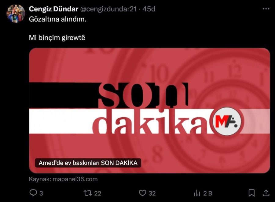 Kayapınar Belediyesi Eş Başkanı, DEM Parti'li Cengiz Dündar, sosyal medya hesabından yaptığı paylaşımda, "Polisler evimi bastı, arama yapıyorlar, gözaltına alacaklar" ifadelerini kullandı.
