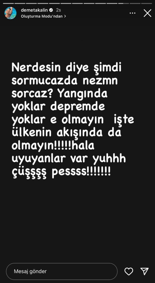 Şarkıcı Demet Akalın, sosyal medya hesabından yaptığı paylaşımda, "Yangında yoklar, depremde yoklar, ülkenin akışında da olmayın; hala uyuyanlar var, pes!" ifadelerini kullandı.
