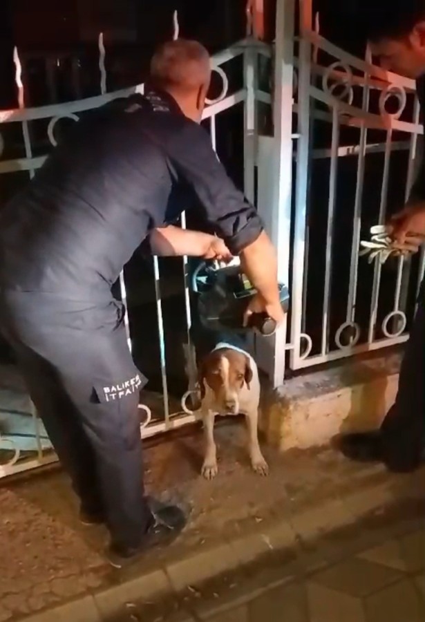 Kısa sürede olay yerine gelen Balıkesir Büyükşehir Belediyesi Bandırma itfaiye ekipleri, demir parmaklıkları makine yardımıyla açarak köpeği kurtardı.