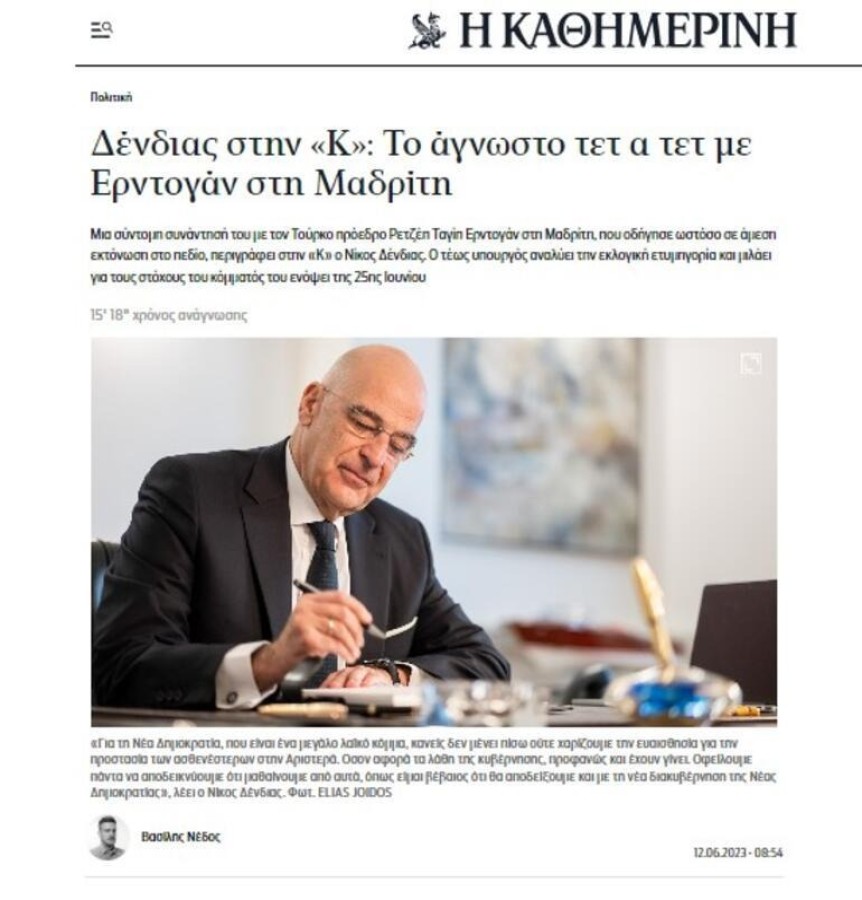 Cumhurbaşkanı Erdoğan'ın 28 Mayıs'ta kazandığı Seçim zaferini ve Türkiye'deki yeni dönemi de değerlendiren Dendias, "Cumhurbaşkanı Erdoğan'ın sadece iç politikada değil, uluslararası ilişkilerde de yeni bir başlangıç yapmaya çalıştığı aşikar. Bu yeni başlangıç noktasının hangi yönde ilerleyeceği konusunda bir sonuca varmak için elbette çok erken. Burada önemli soru Cumhurbaşkanı Erdoğan'ın 21. yüzyıl Türkiye'si için ne istediğidir.Erdoğan'ın Avrupa ve Yunanistan ile yakın ilişkiler arzulayan müreffeh bir Türkiye'nin yönünü seçmesini arzu ederim" ifadelerine yer verdi.