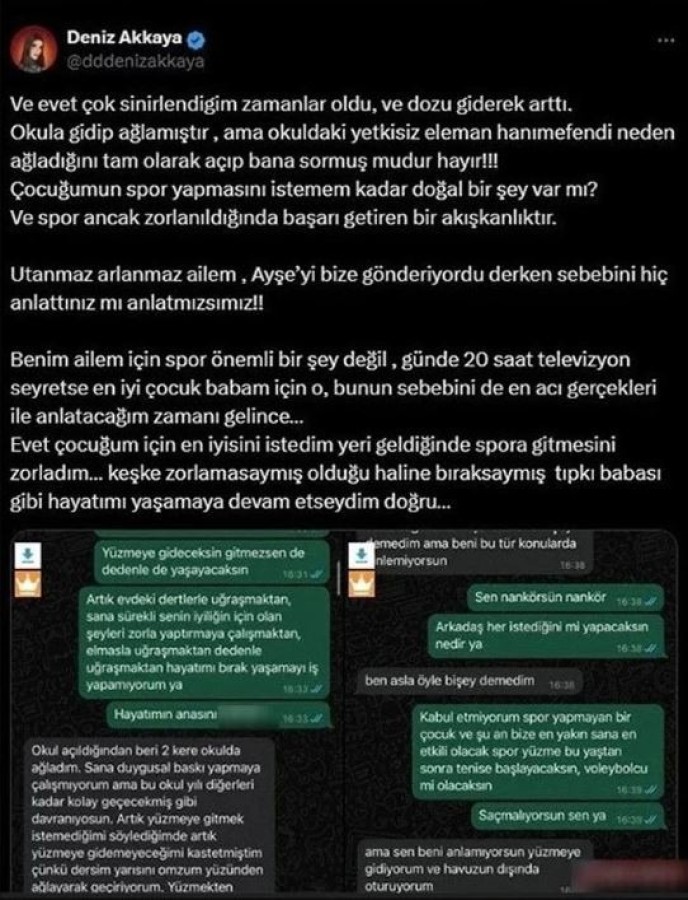 Şimdi ise Deniz Akkaya, kızı ile olan WhatsApp mesajlarını sosyal medya hesabından ifşa etti.