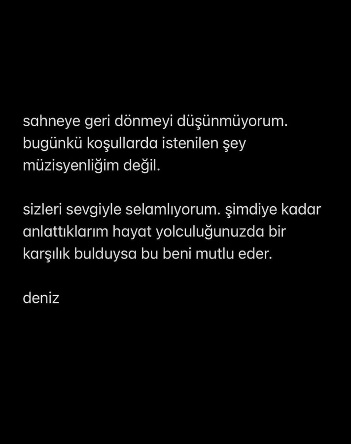 Instagram sayfasından uzun bir açıklama yayınlayan Deniz Tekin, müziği bıraktığını şöyle duyurdu: