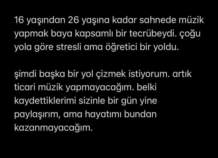"16 yaşından 26 yaşına kadar sahnede müzik yapmak çok kapsamlı bir tecrübeydi. Çoğu yola göre stresli ama öğretici bir yoldu. Şimdi başka bir yol çizmek istiyorum. Artık ticari müzik yapmayacağım. Belki kaydettiklerimi sizinle bir gün yine paylaşırım ama hayatımı bundan kazanmayacağım."