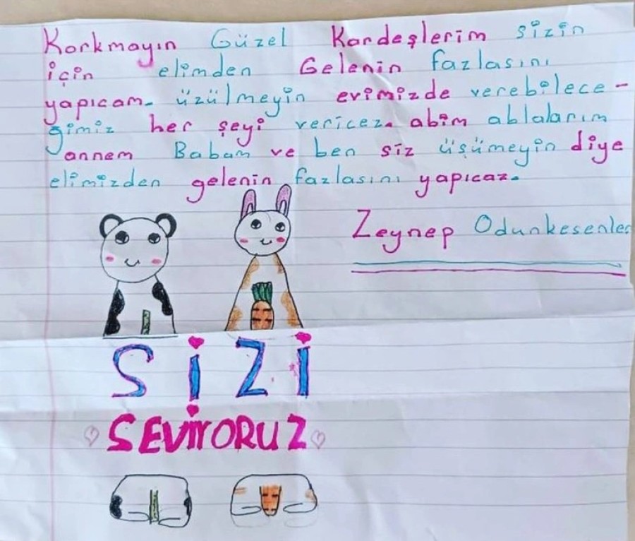 "Tulumları alan depremzedelerden bir aile paketin içinden küçük Zeynep'in yazısı ile karşılaşmış. Aile çok duygulanmış. Zeynep'e bir not iletmemi istediler. Aktarıyorum. Zeynep seni seviyoruz, Adıyaman'da bir ailenin olduğunu bilmeni istiyoruz..."