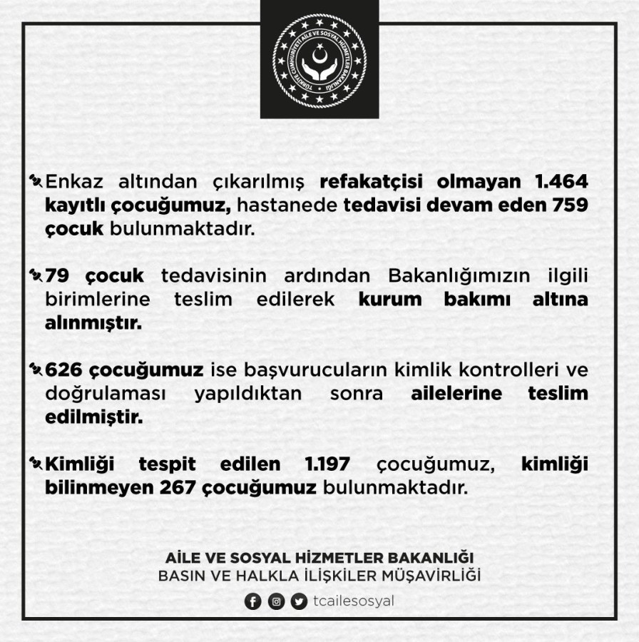 "Refakatçisi olmayan 1464, tedavisi devam eden 759 çocuk bulunmaktadır. 79 çocuk tedavisinin ardından kurum bakımına alınmıştır. 626 çocuğumuz kimlik kontrollerinden sonra ailelerine teslim edilmiştir. Kimliği tespit edilen 1197, edilmeyen 267 çocuğumuz bulunmaktadır."
