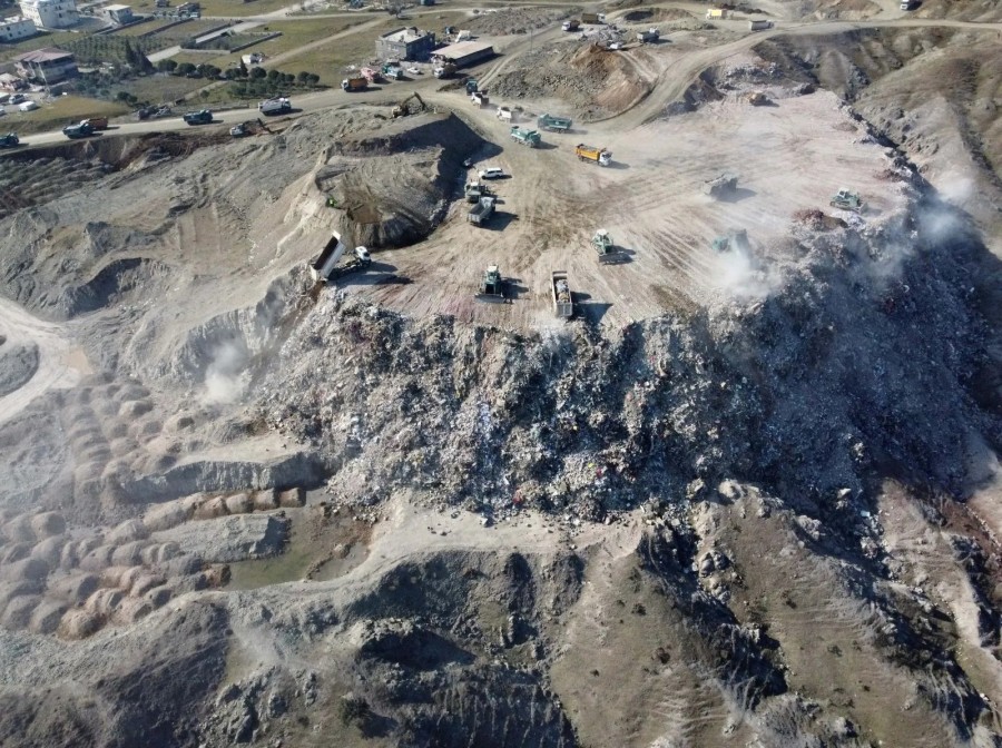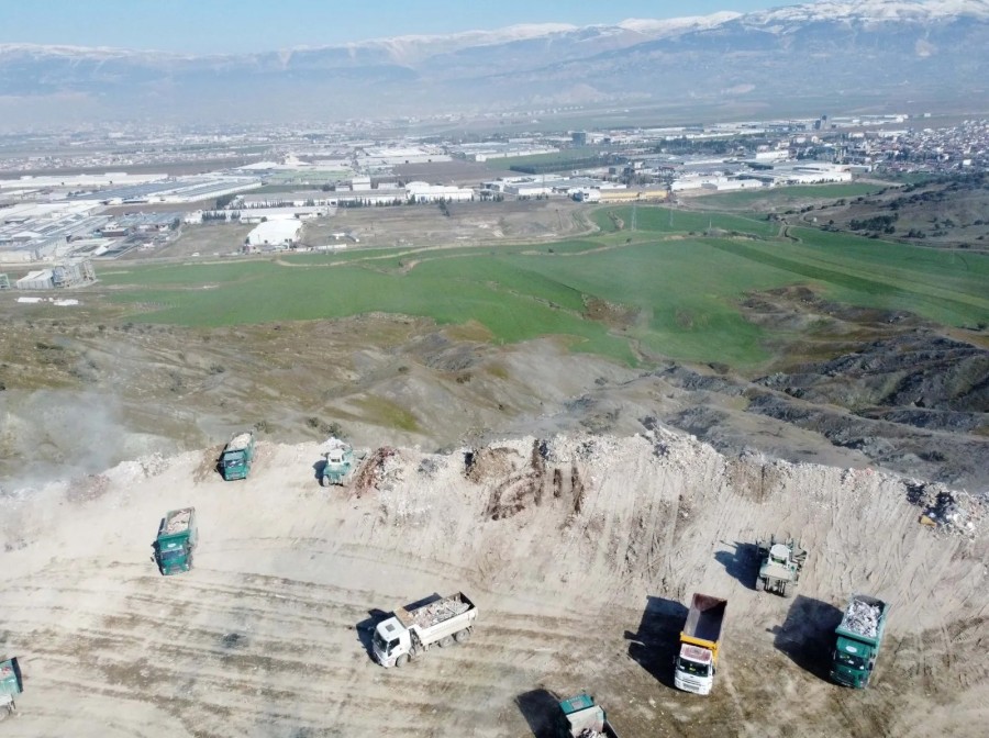 Kahramanmaraş'ta depremde yıkılan ve arama kurtarma çalışmalarının sona erdiği binaların enkazının kaldırılmasına yönelik çalışmalar devam ediyor. Molozların oluşturduğu enkaz birikintisi ise "dağ" gibi oldu.