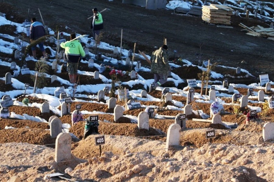 Kahramanmaraş merkezli 10 ili kapsayan 7,7 ve 7,6 büyüklüğündeki depremlerde hayatını kaybedenler toprağa veriliyor. Depremin ağır hasar verdiği illerden Malatya'da, Şehir Mezarlığında kepçeler tarafından kazılarak numaralanan mezarlara dualar eşliğinde defin yapılırken, mezar taşına asılanlar ise yürekleri sızlatıyor.