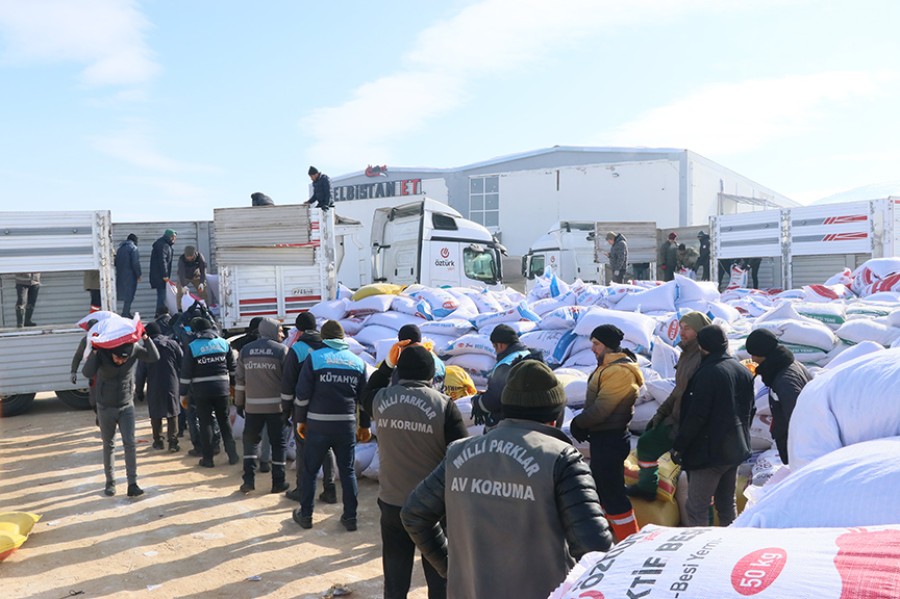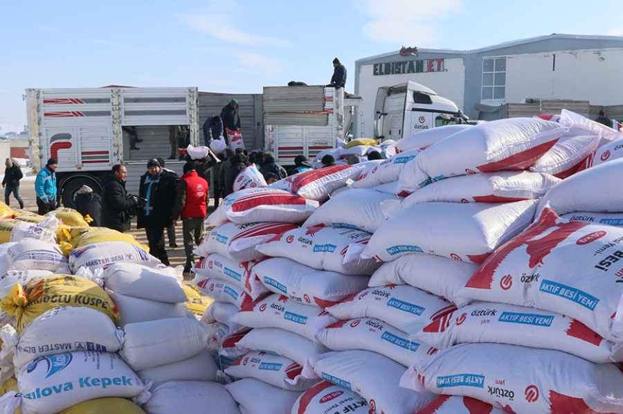 "Asrın felaketi" olarak nitelendirilen depremlerin merkez üssü Kahramanmaraş'a bağlı Elbistan ilçesinde, Tarım ve Orman Bakanlığı ekipleri, besicilere yaklaşık 100 ton ücretsiz yem desteği yapıldı.