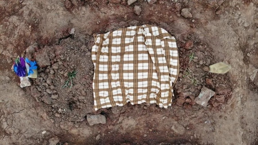 Kimi mezarların üzerine battaniye örtülürken, kim mezar taşlarına ise depremzedelerin enkaz altından kurtarılan bere, eşarp, atkı tişört gibi kişisel eşyaları da mezar taşına giydirildi.