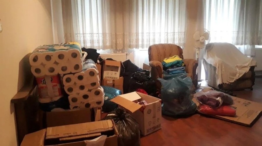 F.T.'nin evinde yapılan aramada depremzedelere ulaştırılmak üzere toplanan çok sayıda hijyen malzemesi, yorgan, battaniye, el feneri, çorap, tuvalet kağıdı ve ıslak mendil gibi ürünler bulundu.
