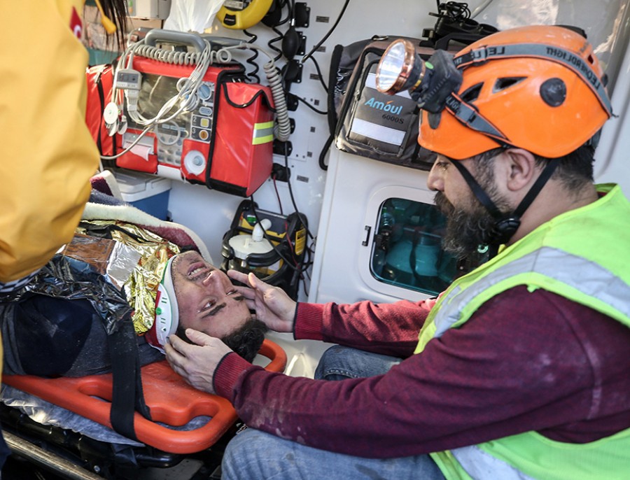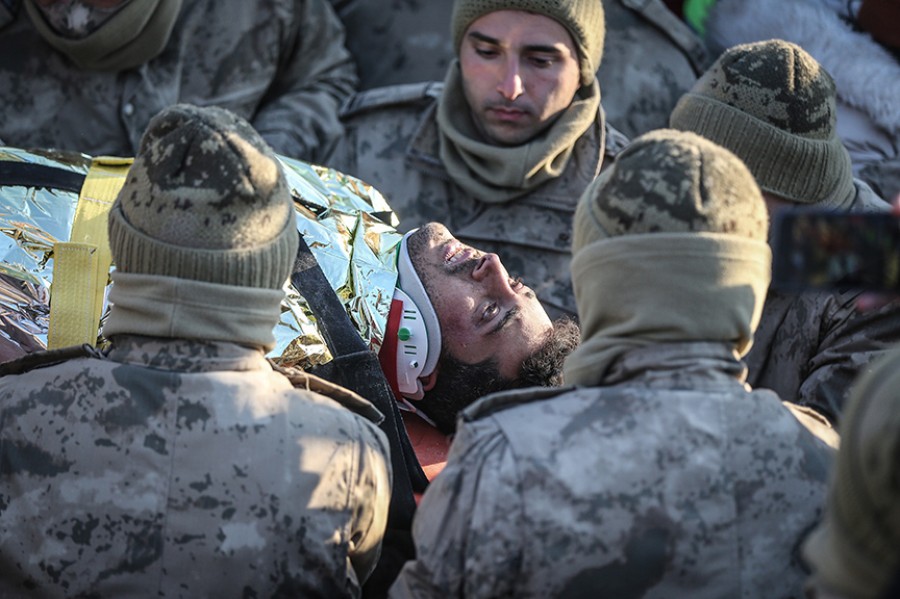 Hatay'ın Antakya ilçesi Güzelburç Mahallesi'nde yıkılan 600 Konutlar Sitesi'nde depremden 101 saat sonra kurtarılan inşaat mühendisi 30 yaşındaki Hikmet Yiğitbaş, enkazdan çıkarılıp ambulansa alındıktan sonra arama kurtarma gönüllüsü Mustafa Aydın'a sarıldı.