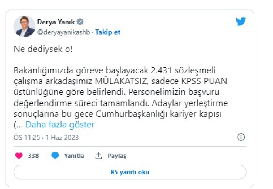 "Ne dediysek o! Bakanlığımızda göreve başlayacak 2 bin 431 sözleşmeli çalışma arkadaşımız mülakatsız, sadece KPSS puan üstünlüğüne göre belirlendi. Personelimizin başvuru değerlendirme süreci tamamlandı. Adaylar yerleştirme sonuçlarına bu gece Cumhurbaşkanlığı kariyer kapısı (https://kariyerkapisi.cbiko.gov.tr) üzerinden ulaşabilirler. Hayırlı olmasını diliyorum."