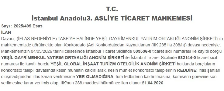 İstanbul Anadolu 3'üncü Asliye Ticaret Mahkemesi, Yeşil GYO ve Yeşil Global İnşaat şirketlerine ilişkin karar verdi.