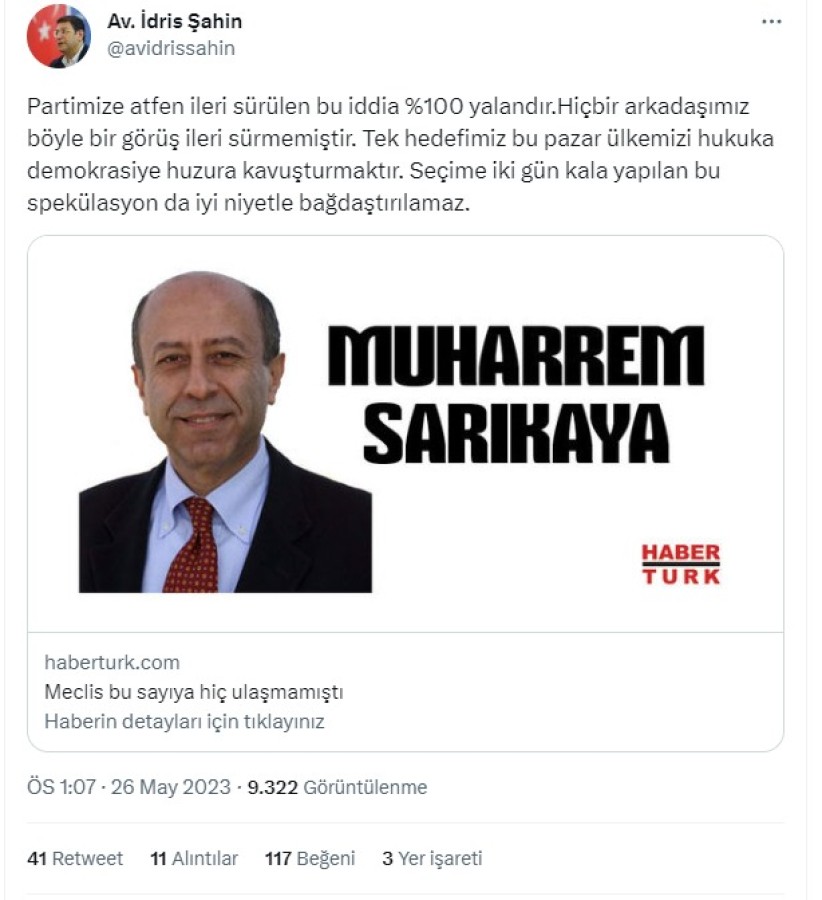 DEVA Partisi Genel Başkan Yardımcısı İdris ŞahinTwitter paylaşımında Sarıkaya'nın yazısını alıntılayarak şu ifadelere yer verdi: