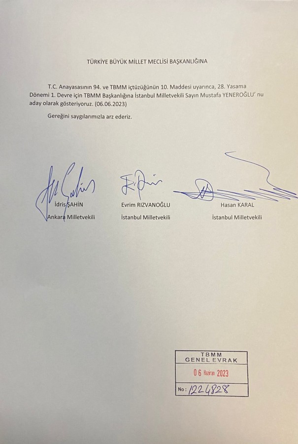 DEVA Partisi Genel Başkan Yardımcısı ve Parti Sözcüsü İdris Şahin'in sosyal medya hesabından yaptığı paylaşım ile Meclis Başkanı adayının Mustafa Yeneroğlu olduğunu duyurdu. Şahin'in paylaşımı şöyle: