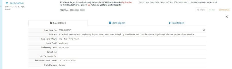 " Yüksek Seçim Kurulu 14 Mayıs seçimlerinde kullanılacak oy pusulaları için ihale ilanına çıktı. İlana göre toplam 249.670.310 adet birleşik oy pusulası basılacak. İki yüz kırk dokuz milyon altı yüz yetmiş bin!"